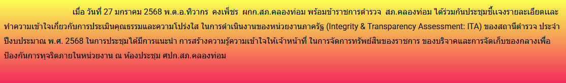 ประจำปีงบประมาณ พ.ศ. 2568 โดยมี พันตำรวจเอกทิวากร คงเพ็ชร ผู้กำกับการสถานีตำรวจภูธรคลองท่อม เป็นประธานการประชุม ซึ่งการประชุมดังกล่าวมีวัตถุประสงค์เพื่อแจ้งคำสั่งแต่งตั้งคณะกรรมการขับเคลื่อนการประเมินคุณธรรมและความโปร่งใสในการดำเนินงานของหน่วยงานภาครัฐ (Integrity & Transparency Assessment: ITA) ของสถานีตำรวจ